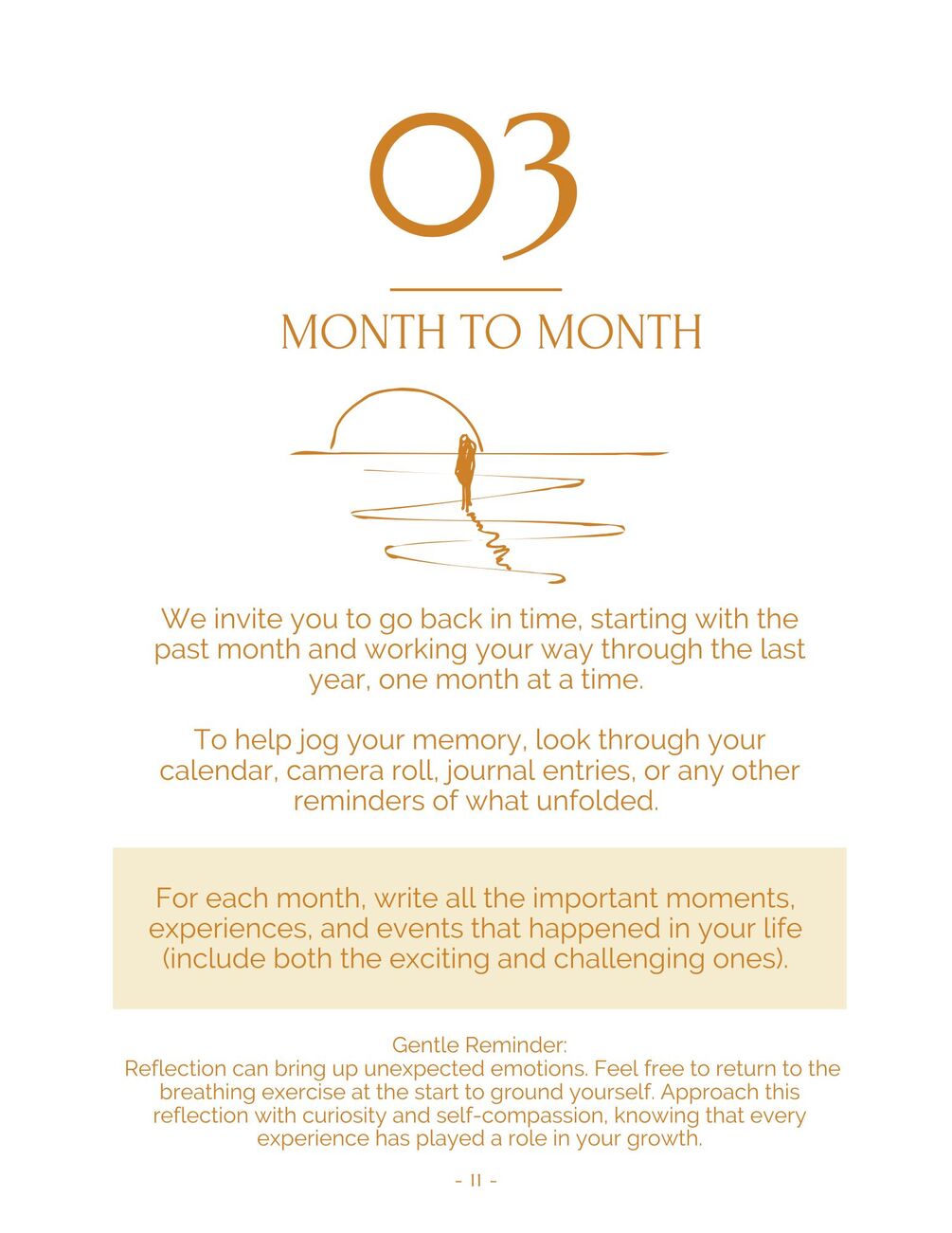 - Reflect on the past through month-by-month prompts that reveal your lessons, growth, and milestones.